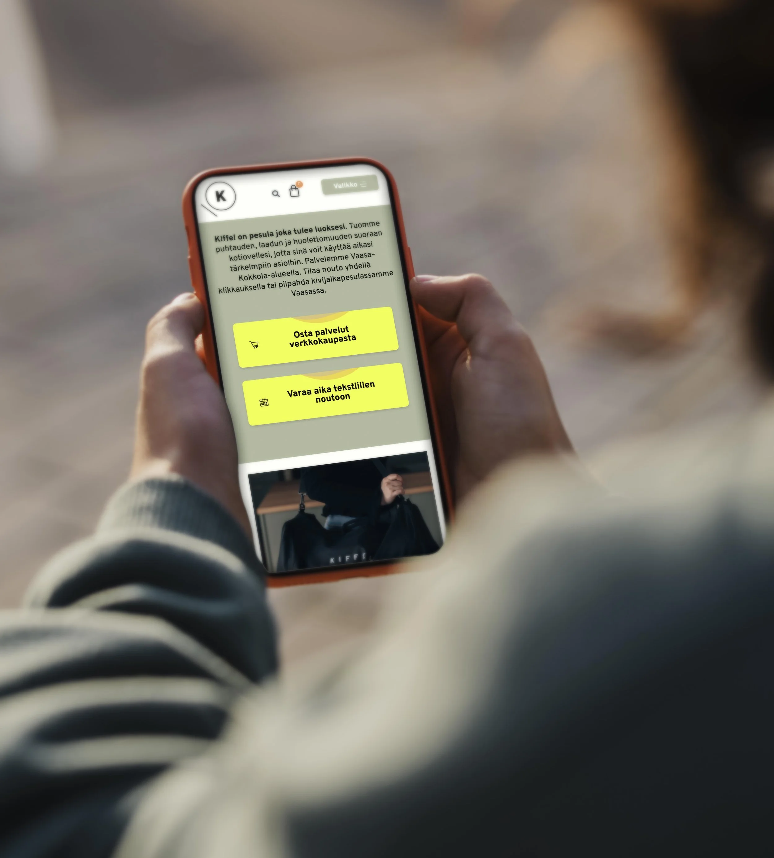 Auditoinnin ja toimenpiteiden myötä etusivun ja Pyykkikassi™-alasivun rakenne ja sisältö uudistettiin. Hero-osio suunniteltiin uudelleen videoa ja ydinviestiä korostaen, palvelutarjonta tiivistettiin myyvämpään muotoon, ja ostoprosessi kuvattiin selkeästi vaiheittain. Tilaa nouto kotiovelle -osio sai oman visuaalisesti erottuvan alueensa, ja CTA-painikkeet yhtenäistettiin koko sivustolla. Lisäksi tehtiin Kiffelin brändiin sopiva kuvitussarja selkeyttämään “Näin se toimii” -osiota.